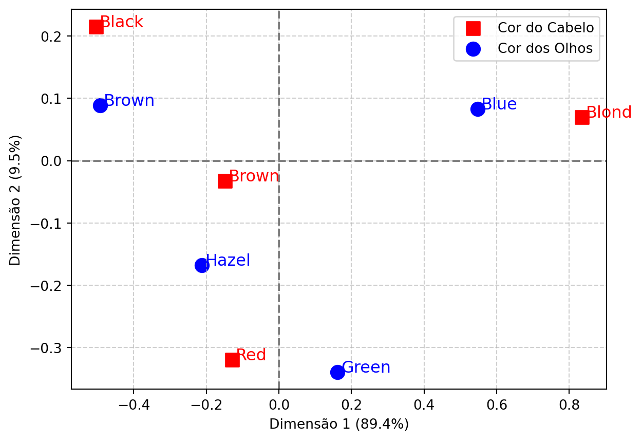• Interpretação: A Dimensão 1 representa o contraste “cores escuras vs. claras”. À esquerda do eixo, temos as categorias de cabelo e olhos escuros; à direita, as claras. Isso confirma que a associação mais forte nos dados é entre cabelo/olhos escuros e cabelo/olhos claros.