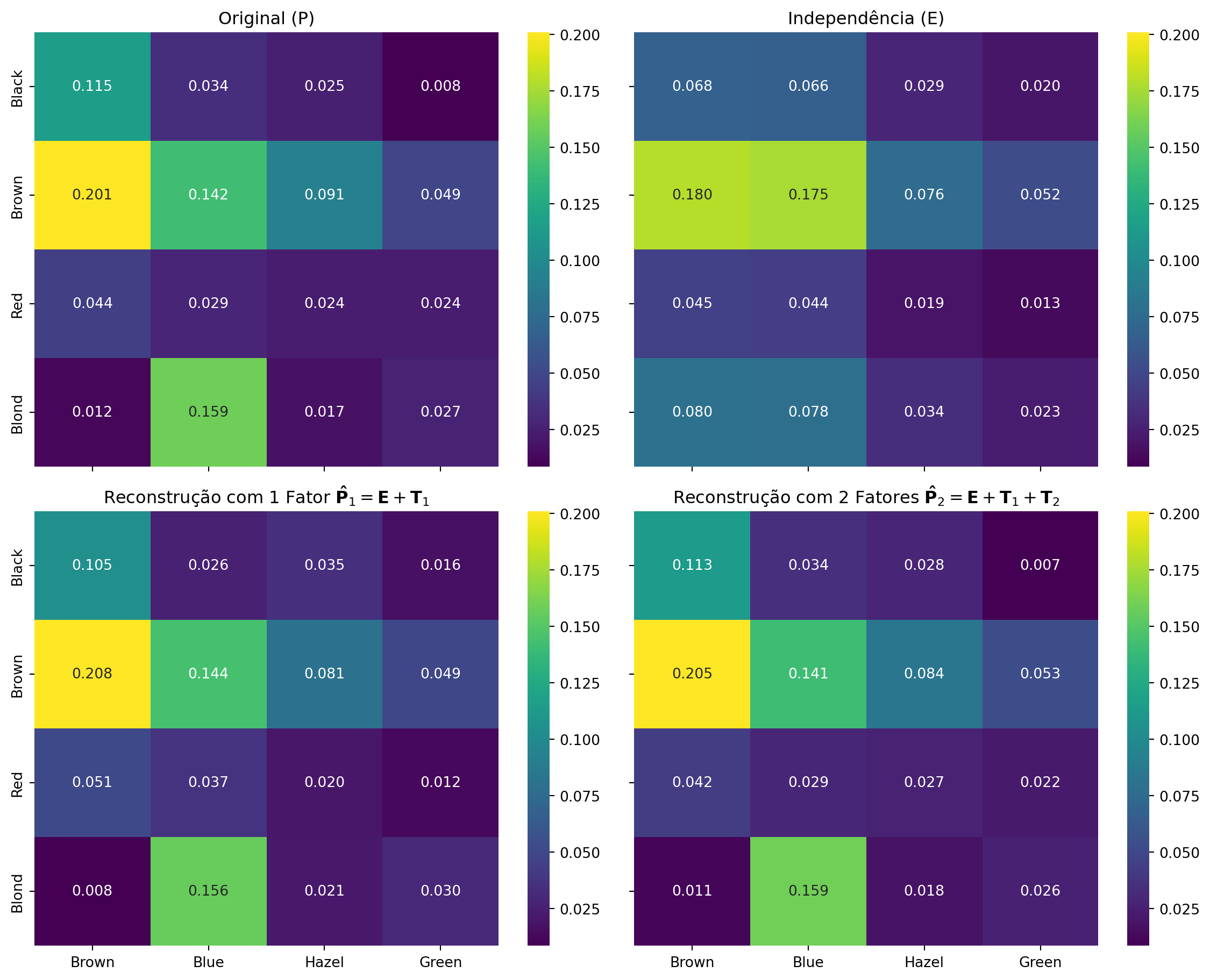 O mapa de calor da reconstrução com 2 fatores já é visualmente muito similar ao original, mostrando que as duas primeiras dimensões capturam a maior parte da associação. Se adicionarmos o terceiro (e último) par de fatores, isto é \(\mathbf{P} - \mathbf{E} = \mathbf{T}_1 + \mathbf{T}_2 + \mathbf{T}_3\), teriamos uma reconstrução perfeita.